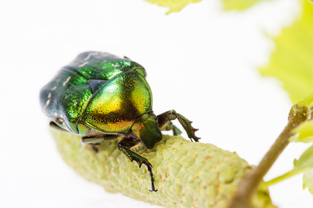 Rose chafer crawling on a branch (Cetonia aurata) on a white background
