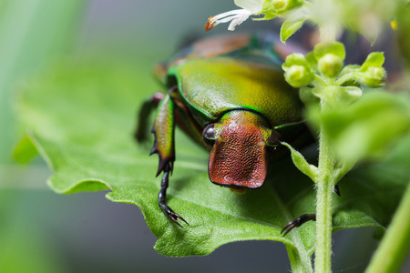 Close up of a green chafer on a green leaf in nature
