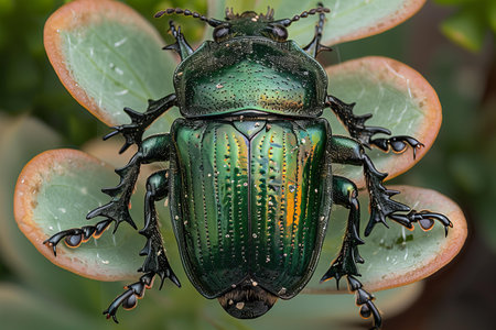 Captivating close-up of a colorful beetle displaying iridescent wings perched on vibrant green leaves, showcasing the beauty of nature's diversity and intricate details.