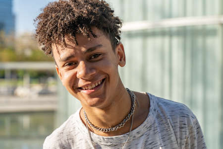 Young handsome black African American boy portrait looking at camera outdoors in the campus during a sunny day.