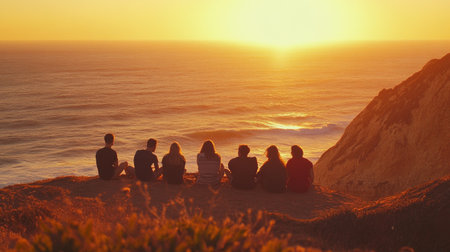 Friends gather on a cliffside to enjoy a breathtaking sunset over the ocean, capturing a moment of beauty, connection, and tranquility in nature's embrace.
