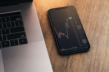 Financial stock market graph on the smartphone screen on wooden background with a computer beside it. Top view. Stock Exchange.