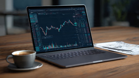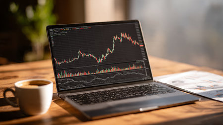 Real-time trading charts glow on a sleek laptop screen placed next to reports and a steaming coffee on a wooden desk.