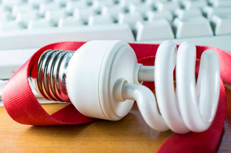Energy saving lamp on a red tape
