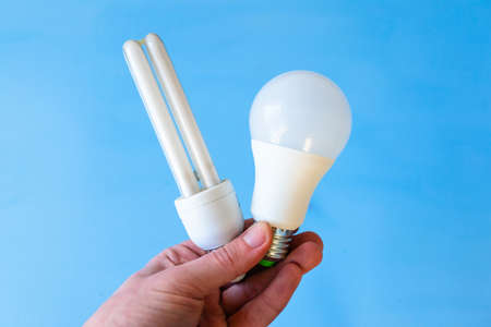LED and energy saving light bulbs side by side in one hand on blue background