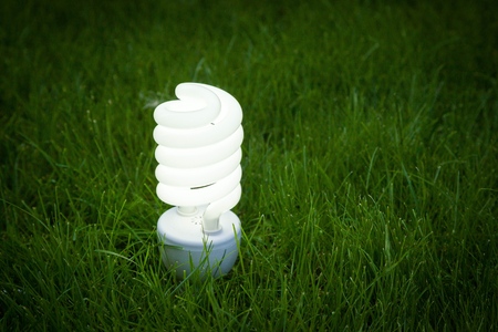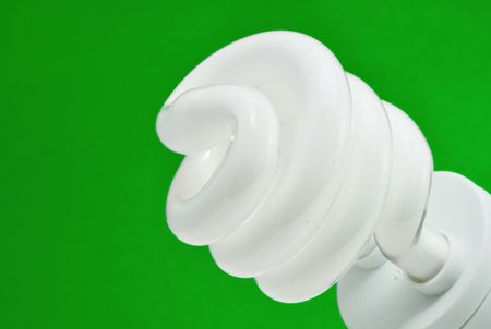 A compact flourescent bulb on a green background - energy saving, environmental theme