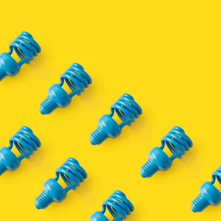 Blue light bulb pattern on yellow background. Colorful and creative concept with copy space.