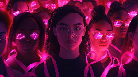 AI illustration for Breast Cancer Awareness Month, many women united with pink ribbons, supporting each other in remission journey