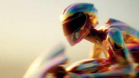 Futuristic chromatic racer on motorcycle: speed, color, and motion.