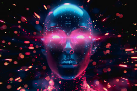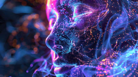 Futuristic AI with neon lights and digital particles.