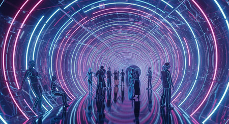 A striking, circular tunnel is illuminated by concentric rings of vibrant blue and pink neon lights. The tunnel recedes into a distant point, creating a strong sense of perspective. Silhouettes of human figures, some standing and some seated, are positioned within the tunnel, appearing as if they are exploring or experiencing a digital realm. The reflective floor mirrors the intense neon glow, enhancing the futuristic and immersive ambiance.