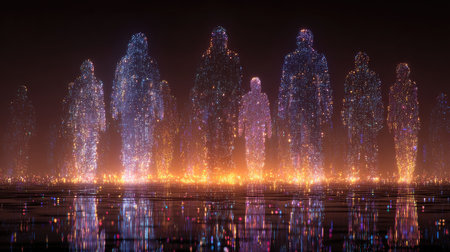 This captivating image showcases a group of glowing figures standing in a mystical environment, with reflections shimmering on the surface, evoking emotions of tranquility and wonder.