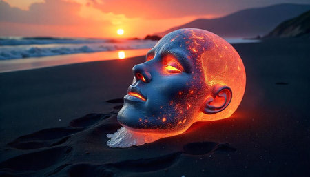 Surreal glowing head on beach at sunset digital art
