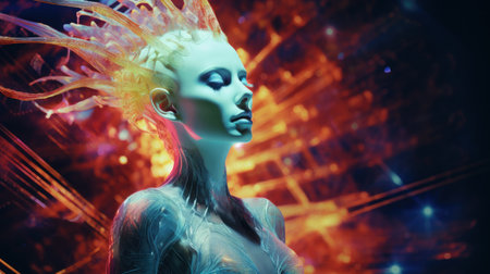 3d rendering of a female robot in futuristic cyberspace.