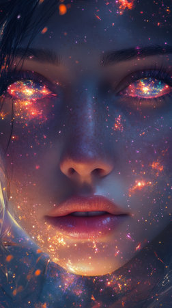 A captivating portrait displays a woman's face infused with cosmic elements, featuring glowing eyes and a serene expression. The background is filled with a starry and mystical atmosphere.