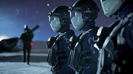 Astronauts stand in formation on a desolate lunar surface, preparing for a mission while another figure approaches in the background.