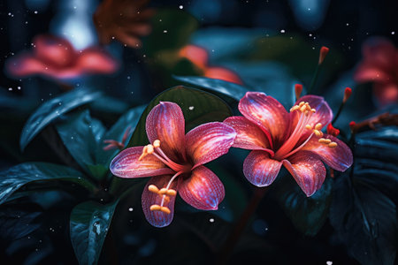 A stunning close-up of vibrant flowers adorned with dew drops, glowing beautifully at night. This artistic portrayal highlights nature's delicate charm.