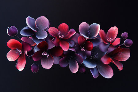 Delicate plum petals intertwine in a captivating arrangement, showcasing rich hues of purple and red. This intricate display evokes a sense of elegance and tranquility against a dark backdrop.