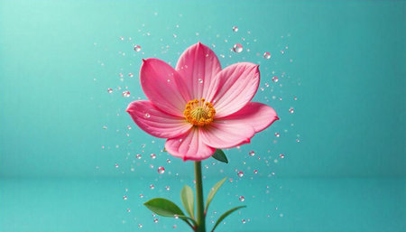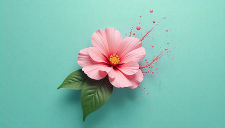 Vibrant pink flower with paint splashes on turquoise background