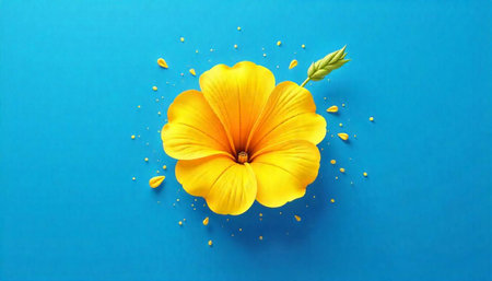 Yellow sunflower on blue background with scattered petals illustration