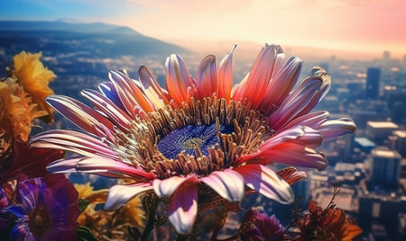 A large flower with a city in the background