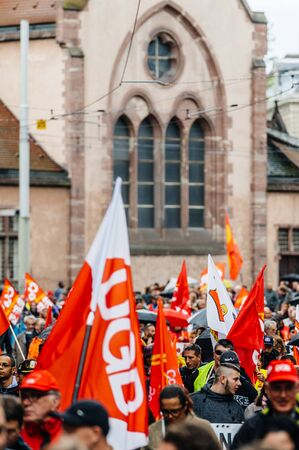 STRASBOURG, FRANCE - MAR 22, 2018: CGT flags at demonstration protest against Macron French government string of reforms, mutiple trade unions called public workers to strike
