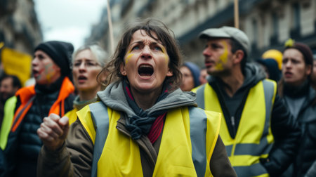 Diverse protestors raise fists in urban street protest