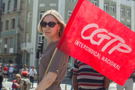 PORTO, PORTUGAL - MAY 1, 2019: Celebration of May Day in the Oporto centre. General Confederation of Portuguese workers, traditionally associated with the Communist party, has 800.000 members.