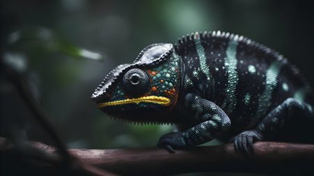 An AI generated illustration of A vibrant chameleon perched atop a tree branch, showcasing its bright colors