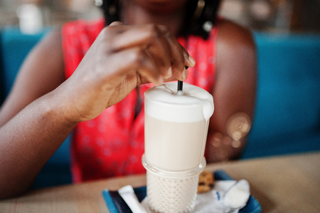 Close up photo of cup latte at african american woman hands sitting at table on cafe.