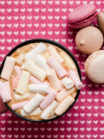 Top view hot beverage with whipped cream,marshmallows and heart shaped chocolate candies on pink pastel background
