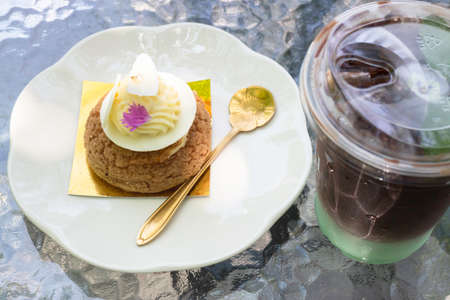 man hand use spoon mix coffee and sugar in the morning. cake and coffee on the wood table.