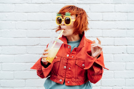 Hipster fashion young woman in bright clothes and pineapple glasses drinking fruity sugar flavored tapioca pearl bubble tea with straw on the white brick wall background. Selective focus. Copy space
