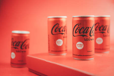 Bangkok, Thailand - June 3, 2021 : Mini can of new Coca-Cola Coke without Sugar comes with a new look on a red background. The most popular beverage is a carbonated beverage produced by Coca-Cola.