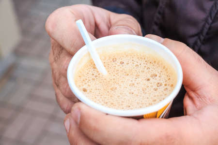 Male hand hold paper cup with coffee