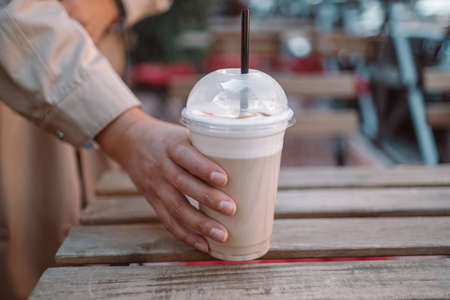 Person takes a hot plastic glass with fragrant latte coffee from a wooden table in a street cafe. Space for text