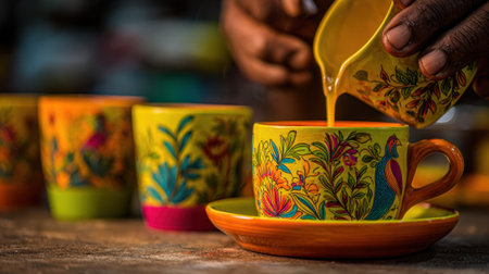 Artisan decorating ceramic cups by digitally transferring intricate designs highlighting the fusion of technology and traditional pottery methods in vibrant colors.
