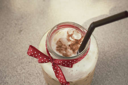 The hot cappuccino cup, decorated with milk foam and sprinkled with coffee powder, gives a very pleasant feeling to drink with copy space