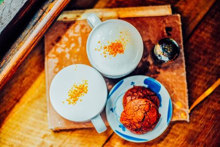 Two Coffee cup of cappuccino and Brownie cookies on the wooden table ,Street coffee, top view.