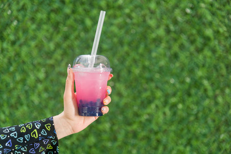 Woman holding bubble tea with lemonade in front of green grass wall