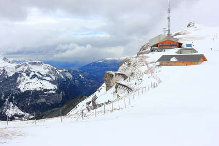 The top station of the aerial cableway Wengen-Männlichen with the Männlichen summit behind. Bernese Alps of Switzerland, Europe.