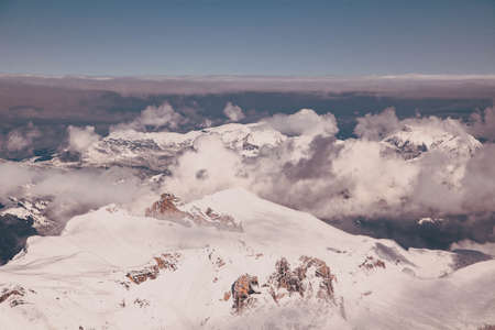 Dolomites in Italy. Beautiful landscape of snowy mountains with cloudy blue sky. Amazing view and panorama shot of rocks and snow.