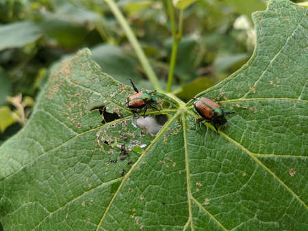A couple of Japanese beetles (popillia japonica) eat a grape leaf.