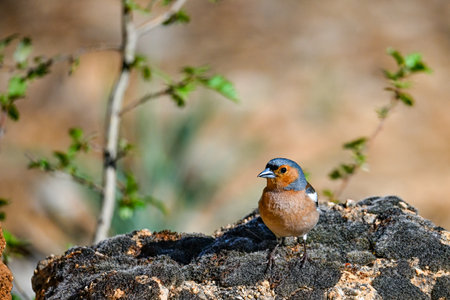 Closeup of a male chaffinch sitting on a rock, sunny day in summer on Italy
