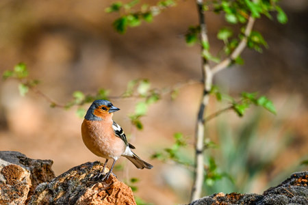 Common Chaffinch sits on a young branch in springtime. Fringilla coelebs