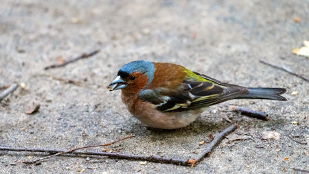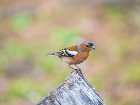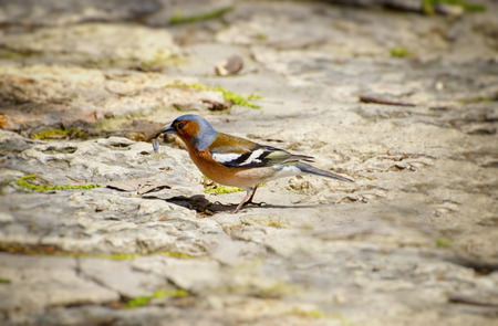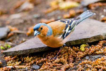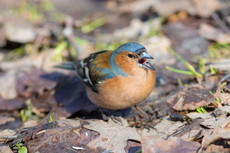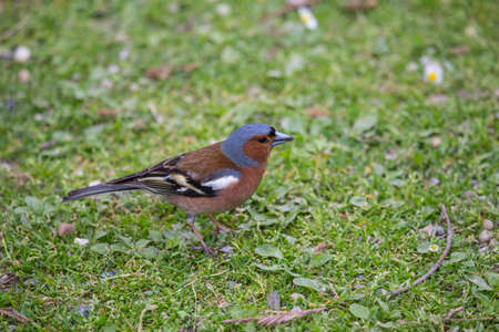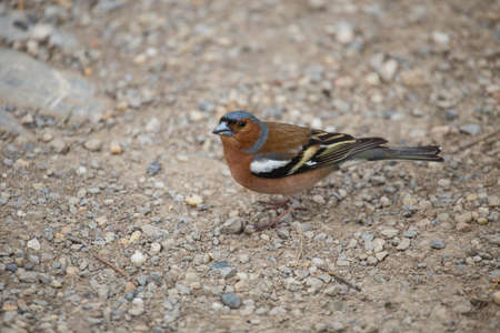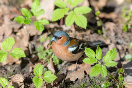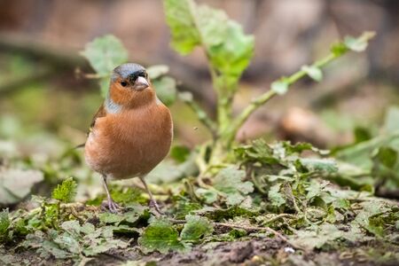 Beautiful songbird Common chaffinch in wildlife posing on ground