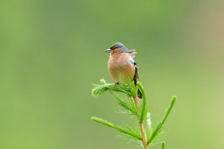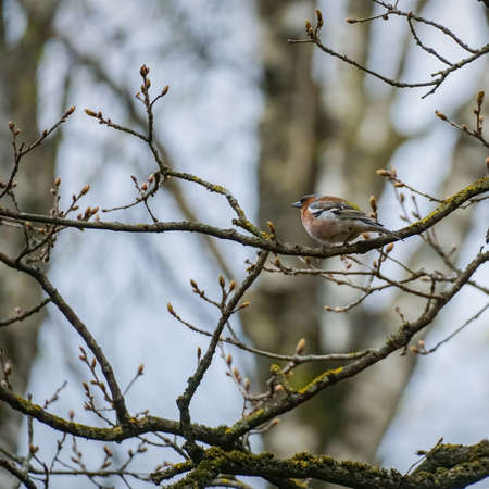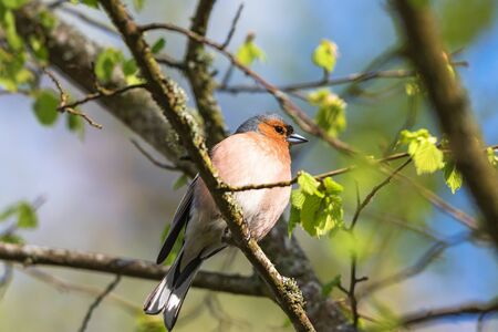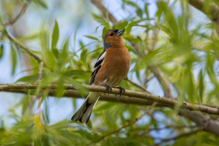 Fringilla coelebs. Photographed in the Finland. Spring nature. From bird life. Bird on the tree. Green Tree. Beautiful picture. The wild nature of the Finland. Europe. Finland. Spring. Forest. Finland