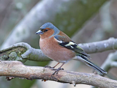 Male Common chaffinch or Fringilla coelebs small passerine bird in the finch family on a tree branch.