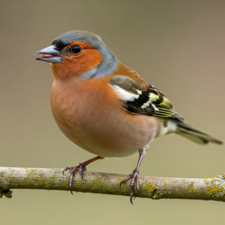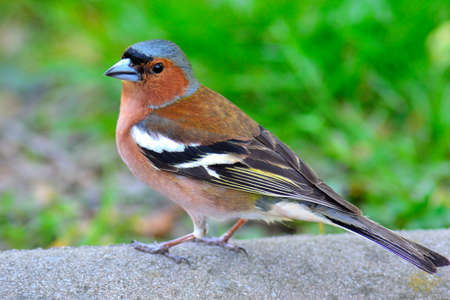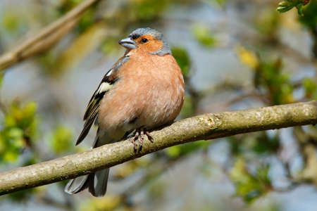 Colorful male chaffinch shows bright plumage with terracotta chest and distinctive wing stripes