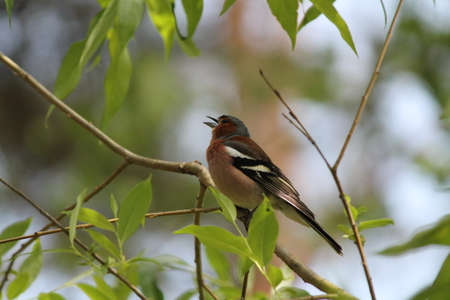 Common Chaffinch bird sitting on a branch and sing ( Fringilla coelebs )